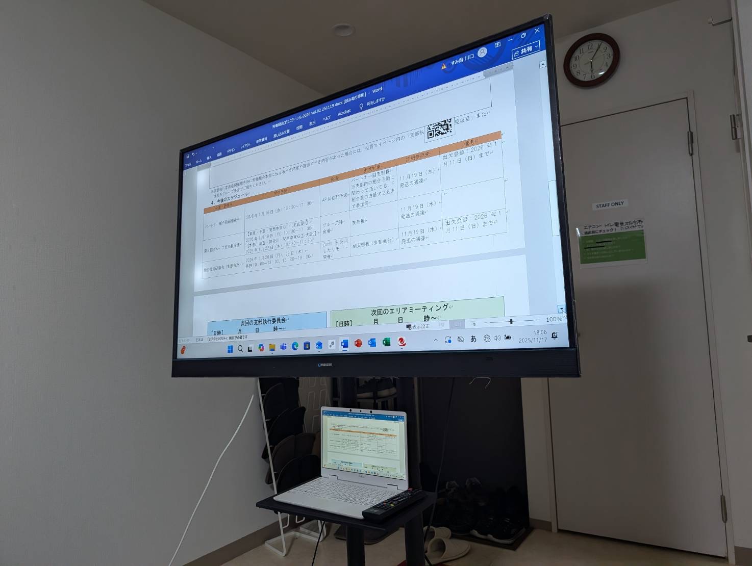 モニターには【労働組合コミュニケーション】が映し出され、現在進行中の活動の確認や、今後新しい活動についてなどの内容をしっかり確認されておりました。