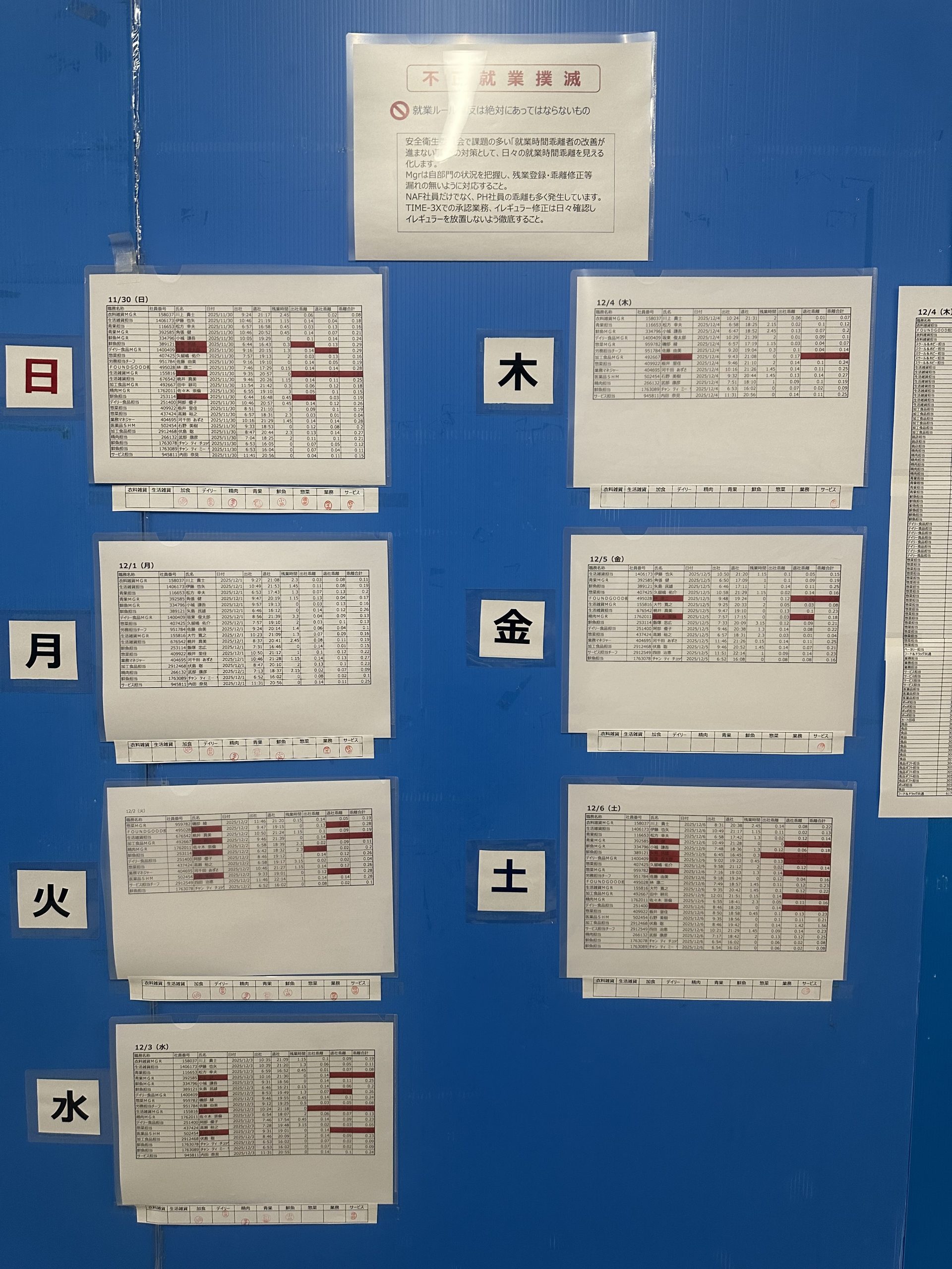 事務所の入口すぐ出たところに、出退社の時間を日別でリスト化し、従業員に注意喚起をしています。