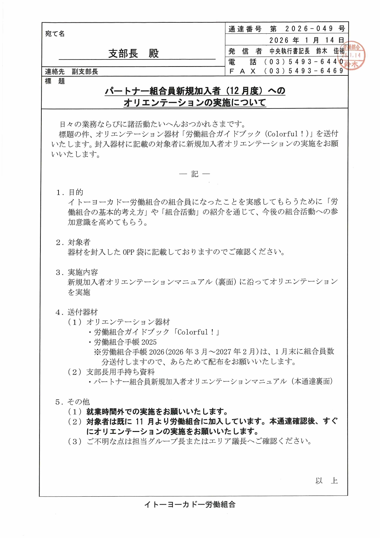 PDFで見るパートナー組合員新規加入者(12月度)へのオリエンテーションの実施について(1000番台支部)