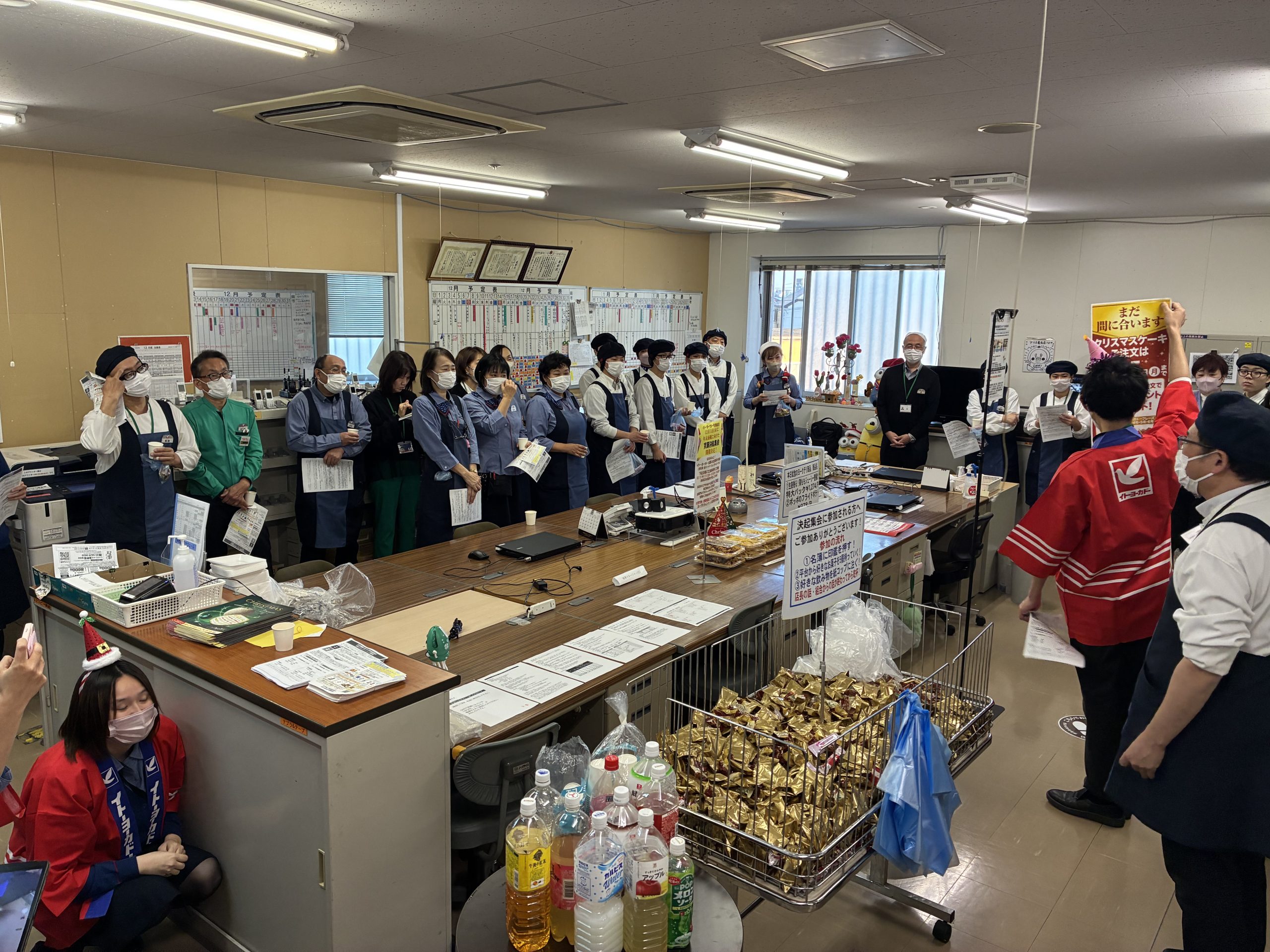 開催前に支部役員の皆さんで役割分担を打ち合わせ!支部役員の皆さんはハッピやサンタ帽も身に着けて盛り上げていきます🎅🎄