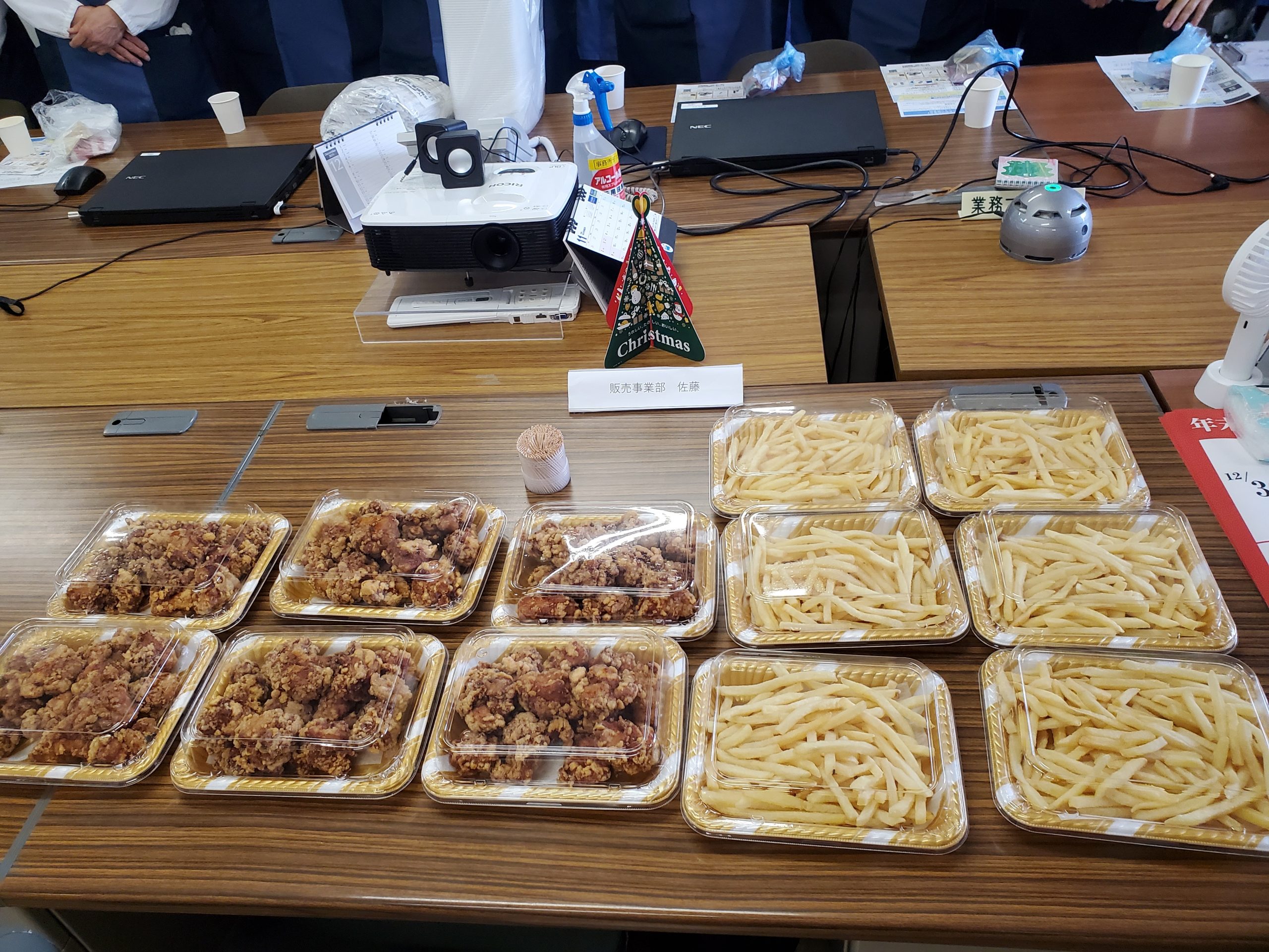 それでは乾杯!といきたいところですが、実は事務所ではいい匂いが漂っていました、その正体は揚げたてのから揚げとポッポのポテト!